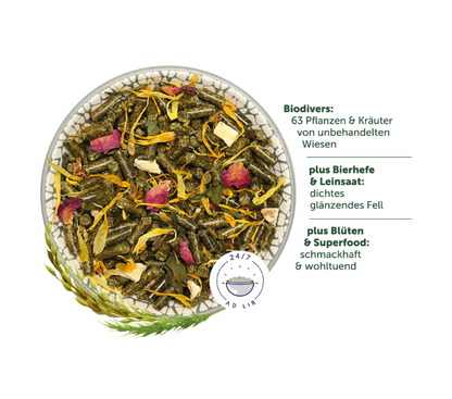 Crecimiento de pastizales permanentes (fleo de los prados, festuca de los prados, festuca roja, cola de zorro de los prados, pasto azul, dáctilo, perifollo silvestre, diente de león rugoso, arveja de los prados, milenrama, alquitrán de los prados, hierba dulce de primavera, trébol campestre, llantén menor, salvia de los prados, pasto tembloroso mediano, bromo erecto, campanilla de los prados, alcaravea, centaurea, pamplina común, cardo rastrero, bromo blando, diente de león común, hierba del césped, reina de los prados, pamplina de los prados, fresa silvestre, arveja de pájaro, verónica camedrio, gavilán de los prados, avena vellosa de los prados, trébol de patas de pájaro, cola de caballo de los prados, galio blanco, geranio blanco, margarita, escabiosa de los campos, colleja de cuco, salicaria purpúrea, verónica de los campos, hierba de avena lisa, hierba lisa de los prados, llantén común, pimpinela mayor, arveja de hoja estrecha, nomeolvides de los campos, saxífraga nudosa, pimpinela menor, potente enramada, prímula, atrapamoscas, pimpinela menor, hierba de los prados, barba de cabra, ortiga mayor, tomillo común, trébol rojo, seto, ginebra, hierba mala, margarita), maíz de planta entera, fleo, harina de girasol, salvado de trigo, harina de linaza, altramuz de planta entera, salvado de avena, harina de colza, grano gastado de cervecería, lignocelulosa, levadura de cerveza inactivada (1,5%), germen de trigo, linaza (1%), proteína de patata, chirivías, tallos de perejil, raíz de achicoria, pétalos de rosa, flores de caléndula, hojas de menta piperita, hierba de alcachofa de Jerusalén, inulina de achicoria, amaranto, hierba de manzanilla, hojas de llantén menor, hierba de diente de león, semillas de hinojo, flores de manzanilla, hierba de cardo mariano, raíz de maca, hojas de salvia (verduras 2%, flores 2%)