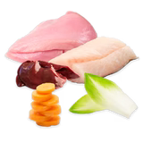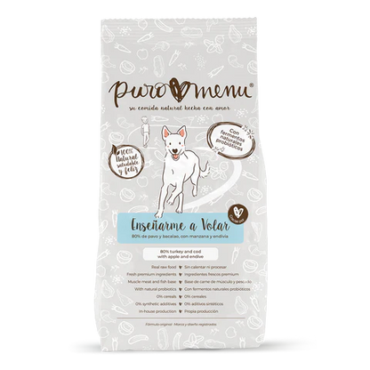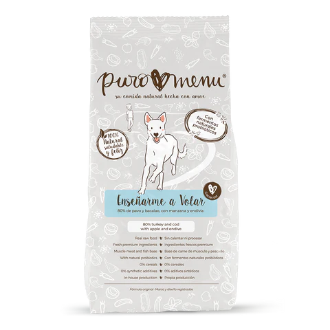 Este menú es único en el mundo de la dieta natural. Los ingredientes principales son el pavo y el bacalao, ambos ligeros y altamente palatables y se combinan con verduras y frutas frescas y suplementos naturales. El ingrediente estrella es la zanahoría BIO fermentada, obtenida mediante fermentación salvaje.