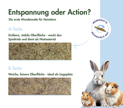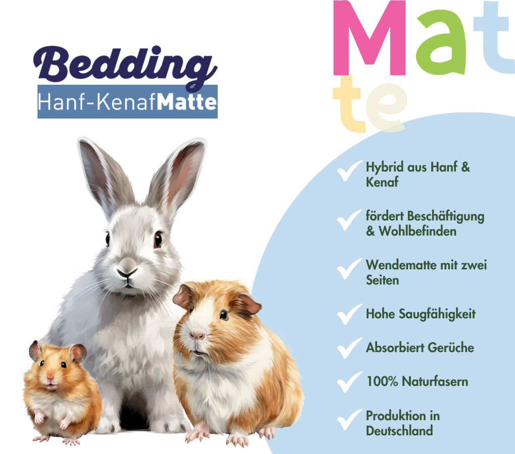 Fabricada en Alemania, la esterilla de cáñamo y kenaf es sinónimo de calidad y sostenibilidad. Sus versátiles aplicaciones incluyen zona de descanso, material de actividad, lecho, suplemento de lecho y material de anidación. Las esterillas recortables son perfectas para recintos y transporte, lo que las convierte en un componente indispensable de cualquier sistema de cría de animales adaptado a su especie.