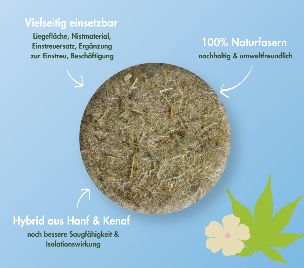En comparación con la esterilla de cáñamo tradicional, la esterilla de cáñamo y kenaf impresiona por su combinación de fibras de cáñamo y kenaf, que garantizan una mayor absorción y mejores propiedades de aislamiento. Los animales muestran una clara preferencia por esta esterilla debido a su mayor comodidad y opciones de estimulación.
