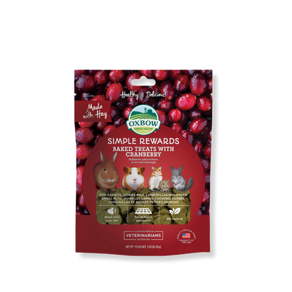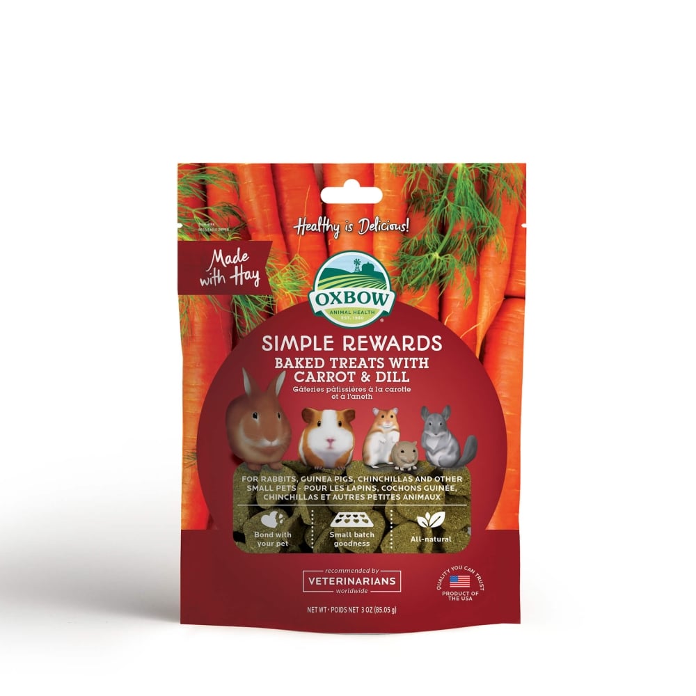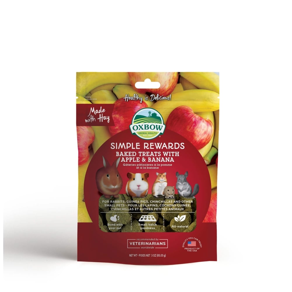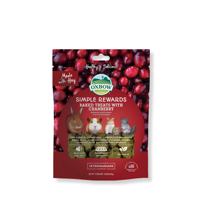 Las nuevas golosinas de Oxbow están hechas con ingredientes sabrosos y nutritivos, como frutas, verduras, hierbas aromáticas y heno Timothy de fibra larga, con lo que puedes darle a tu mascota diariamente sin problemas.