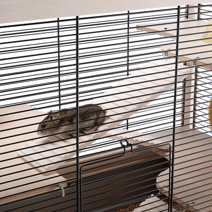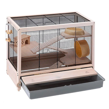 Cómoda y práctica, este hábitat para roedores pequeños también es adecuado para los ratones, presenta un diseño grande también gracias a la estructura de múltiples niveles. Gracias a los diferentes estantes y pisos internos, de hecho, su pequeño amigo tendrá la posibilidad de hacer algo de ejercicio y mantenerse en una forma muy buena; las escaleras de madera incluidas conectan los diferentes sectores de la jaula, permitiendo un fácil acceso a su mascota. Los estantes de madera son tratados con un barniz especial haciéndolos resistentes al líquido, por lo tanto, fáciles de mantener bien limpios.