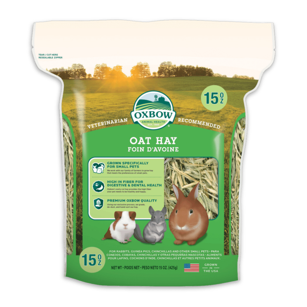 El Heno de Avena Oxbow proporciona bajos niveles de proteína y calcio y muy altos niveles de fibra.