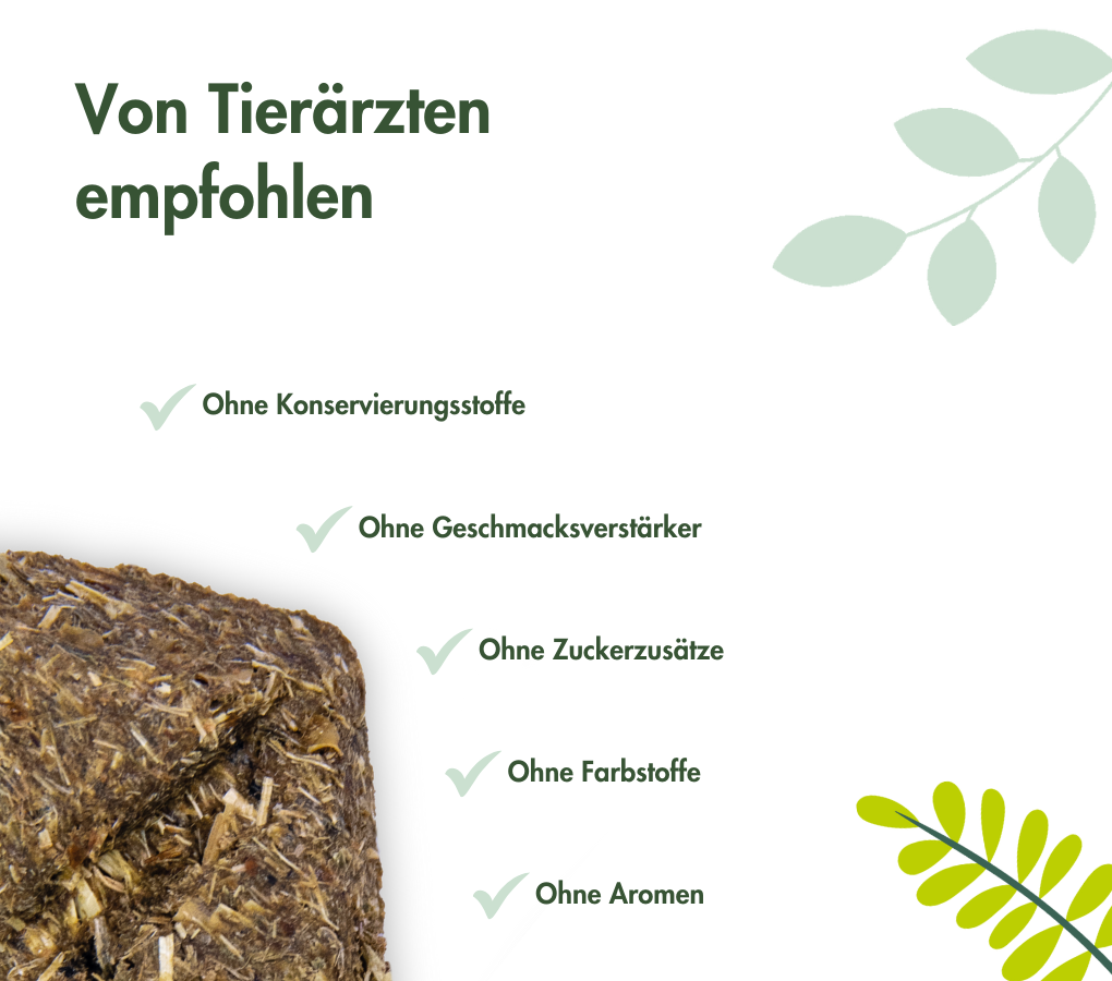 Crecimiento permanente de pastizales, harina integral de espelta, salvado de avena, pulpa de manzana, torta de linaza, hojas de equinácea (1%), polen de flores (0,5%).