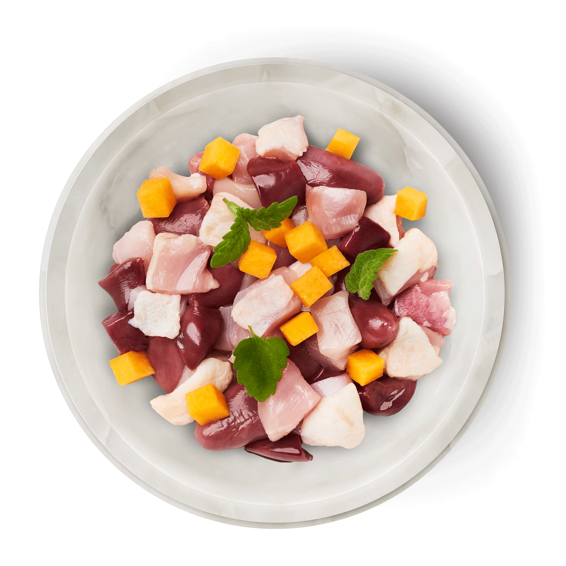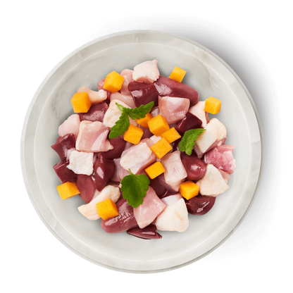 Corazón de pollo (40 %), piel de pollo (20 %), estómago de pollo (12 %), muslo de pollo con piel (10 %), hígado de pollo (10 %), calabaza (4 %), polvo de tomate*, aceite de colza, Aceite de pescado, hierba gatera*, minerales *ingrediente seco