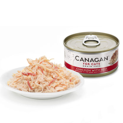 Lata de pollo tierno desmenuzado con deliciosos bocaditos de ternera, cocinado todo en su propio jugo. Una receta deliciosa con proteína animal, sin cereales ni despojos, que ha sido cuidadosamente elaborada para que tu compañero felino tenga una dieta completa y equilibrada. Estas latas se pueden utilizar combinadas con el pienso, como una comida o como un pequeño premio. Estamos seguros de que tu amigo disfrutará de estas latitas.