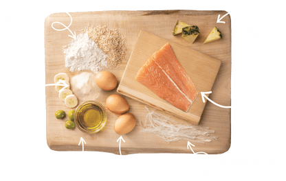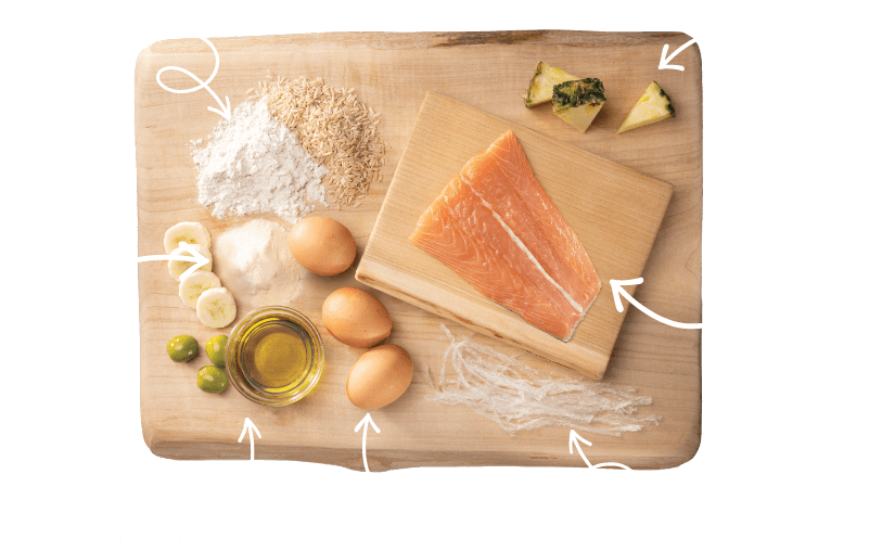 Composición: Salmón salvaje, harina de arroz integral, agar-agar (gelatina vegetal), aceite de oliva, huevos, polvo de plátano y tallo de piña.
