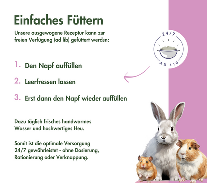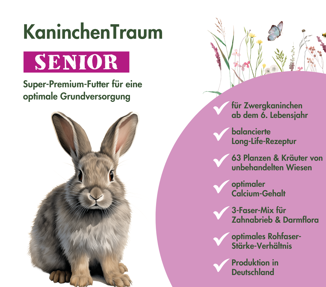 KaninchenTraum SENIOR está perfectamente equilibrado. Se puede alimentar a voluntad . Esto significa: llenar el comedero, dejar que coma y solo entonces volver a llenarlo. Los animales cubrirán únicamente sus necesidades básicas. Además, reciben agua fresca y tibia y heno de alta calidad para conejos a diario . Esto garantiza una nutrición óptima las 24 horas , sin dosis, racionamiento ni escasez. ¡