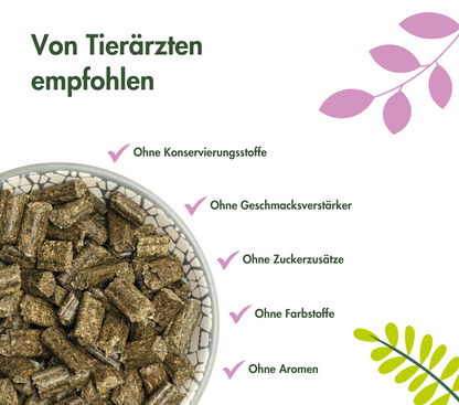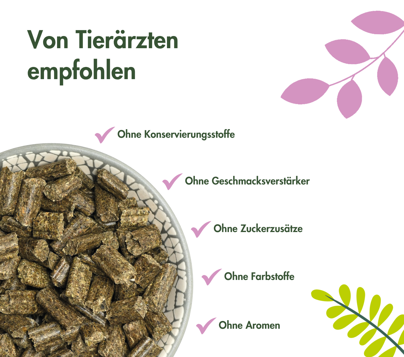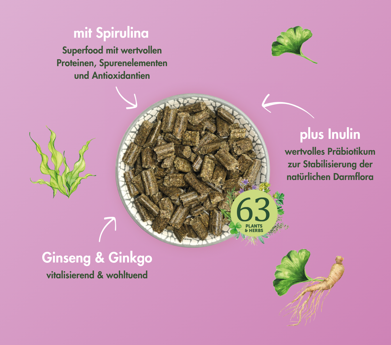 Crecimiento de pastizales permanentes (fleo de los prados, festuca de los prados, festuca roja, cola de zorro de los prados, pasto azul, dáctilo, perifollo silvestre, diente de león rugoso, arveja de los prados, milenrama, alquitrán de los prados, hierba dulce de primavera, trébol campestre, llantén menor, salvia de los prados, pasto tembloroso mediano, bromo erecto, campanilla de los prados, alcaravea, centaurea, pamplina común, cardo rastrero, bromo blando, diente de león común, hierba del césped, reina de los prados, pamplina de los prados, fresa silvestre, arveja de pájaro, verónica camedrio, gavilán de los prados, avena vellosa de los prados, trébol de patas de pájaro, cola de caballo de los prados, galio blanco, geranio blanco, margarita, escabiosa de los campos, colleja de cuco, salicaria purpúrea, verónica de los campos, hierba de avena lisa, hierba lisa de los prados, llantén común, pimpinela mayor, arveja de hoja estrecha, nomeolvides de los campos, saxífraga nudosa, pimpinela menor, potente flor de la India, prímula, pimpinela menor, hierba de los prados, barba de cabra, ortiga mayor, tomillo común, trébol rojo, seto, ginebra, hierba mala, margarita) Salvado de cáscara de avena, harina de girasol, pulpa de zanahoria, salvado de trigo, harina de linaza, germen de trigo, harina de colza, grano gastado de cervecería, linaza, levadura de cerveza, alga espirulina seca (1%), lignocelulosa, inulina de achicoria (0,6%), semillas de cardo mariano, hierba de manzanilla, hojas de ginkgo (0,1%), romero, raíz de ginseng (0,05%)
