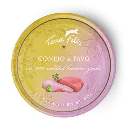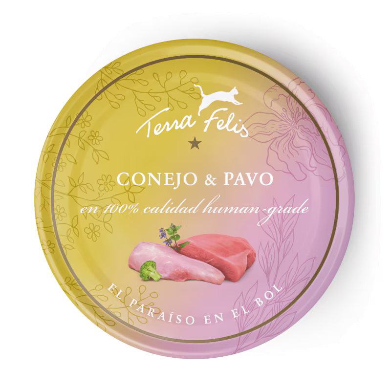 - Carne de conejo (53 %), hígado de pavo (21 %), carne muscular de pavo (8 %), piel de pavo (8 %), brócoli (4 %), tomate en polvo, aceite de colza, hierba gatera*, minerales *ingrediente seco