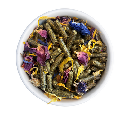 Timothy (41%), salvado de avena, harina de girasol, crecimiento permanente de pastizales, harina de linaza, pulpa de zanahoria, harina de colza, linaza, pétalos de rosa, flores de aciano azul, hojas de abedul (1,5%), inulina, pétalos de caléndula, raíz de trébol (0,75%), hojas de ortiga (0,75%), celobiosa, tomillo, raíz de perejil, hojas de apio de monte, bayas de enebro, grosella negra